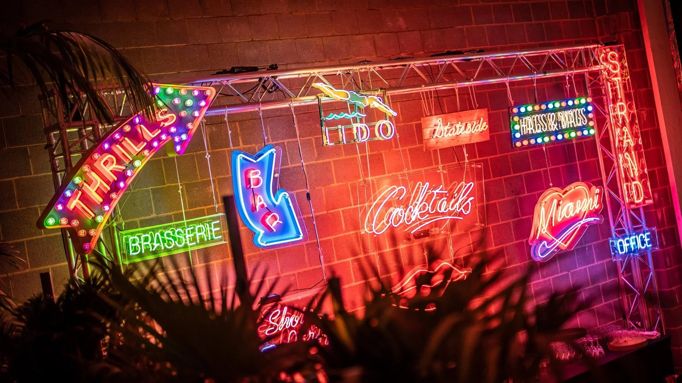 At the heart of the design stood a 18-foot platinum mirrored bar, conceived as the focal point of the room. Framed by an industrial truss arch and adorned with vintage neon signage sourced across London, the installation delivered an immediate visual impact and a striking arrival moment for guests.
