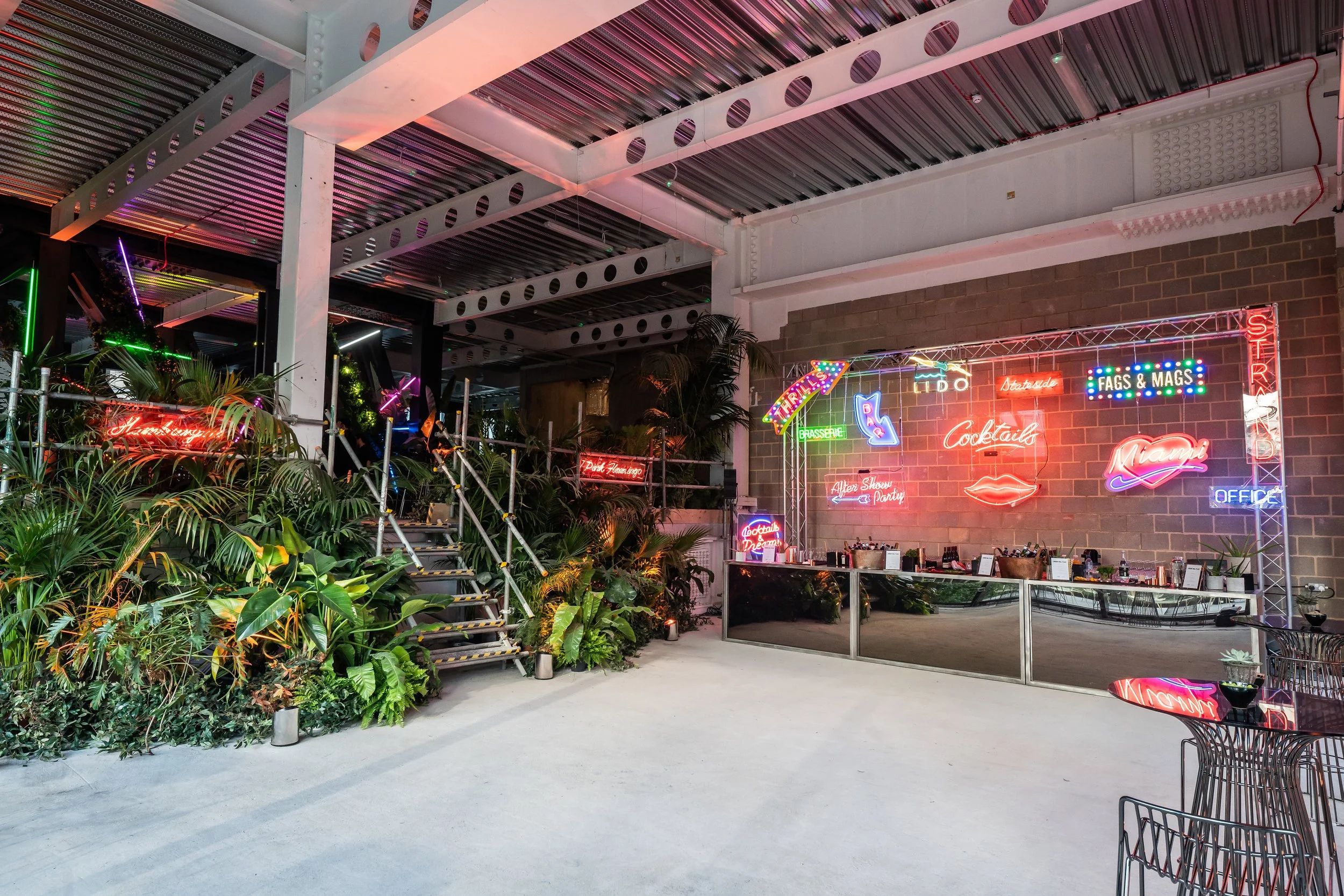 Working from an open brief, I developed a concept that brought the newly installed external landscaping indoors—softening the concrete shell with curated jungle greenery—while contrasting it with stark neon interventions to create a dynamic, contemporary party atmosphere. As dusk fell, the space evolved dramatically: raw concrete surfaces were juxtaposed with architectural neon strips, modern leather lounge seating, and smoked glass poseur tables, creating a refined yet industrial aesthetic.