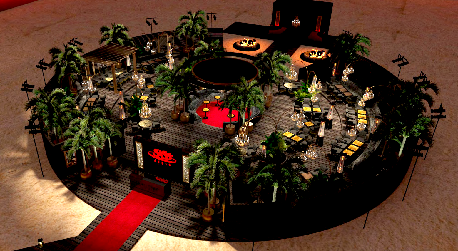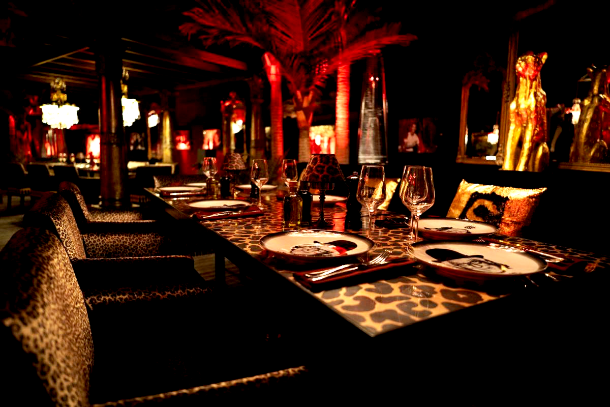 The concept centred around a lush open-air oasis, reimagined as a theatrical dining environment beneath the desert sky. Designed by Tina Green, the restaurant was flanked by towering palm trees, creating a natural perimeter that softened the landscape and framed the experience. Beneath a canopy of glittering vintage chandeliers suspended from an architectural overhead structure, the space unfolded in layers of rich black velvet upholstery, deep crimson accents and curated golden animal ornaments — direct nods to the Monogasque brand’s bold and opulent identity.